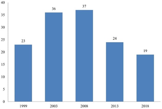 In Figure 15, we observe practically no difference between the number of architecture pages published in 2003 and 2008, 36 and 37, respectively. On the contrary, a remarkable decrease in the annual number of architecture pages was recorded from 2008 to 2013, when the supplement went from 37 annual architecture pages to 24, which meant a reduction of 13 pages. Moreover, the space dedicated to this content decreased even more in 2018. This year, only 19 pages out of a total of 380 in the art section included the subject of architecture, reaching the worst result of all the analyzed years.