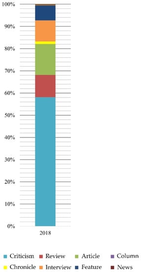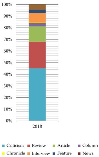 2.5. Journalism Genres in the Art Section of the Cultural Supplements in 2018 (Case of Study)