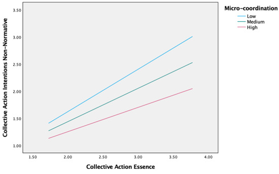 Given the result above, it was of particular interest that we found a different pattern in micro-coordination’s moderating effect for intentions to participate in non-normative actions. The data from this test showed that those at the lowest level of micro-coordination reported the greatest intention to participate in types of collective action that are non-normative. In other words, micro-coordination has a positive interactive effect for non-normative behavior, but mainly for those who micro-coordinate relatively little in their own everyday lives. Although it may seem puzzling on the surface, this relationship also makes sense if we consider it through a normative lens. In this case, the criterion variable reflects behavior that is by definition not normal. It represents a desire to disrupt, not maintain social order. It makes sense that people with socially disruptive behavior intentions may have less opportunity, motivation, and/or reasons to coordinate socially with other people in their daily lives, which may help in interpreting this interaction.