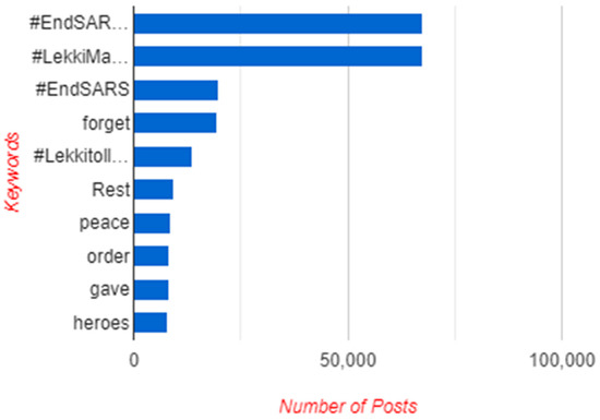 Contents from Twitter (Tweets, replies and retweets) concerning the 2022 #EndSARSMemorial2 protests were examined to know key themes that arose from the tweets and retweets by online activists during the 2022 memorial protests, which were organised to pressure those in government and to remember those that died during the 2020 #EndSARS protests in Nigeria. Figure 2 highlights ten keywords that were prominent in the tweets and replies from netizens in Nigeria. The keyword that was most used in tweets was “#EndSARSMemorial2”. This was followed by “#LekkiMassacre”, “#EndSARS”, “forget”, “Lekkitollgate”, “rest”, “peace”, etc. The “forget” keyword refers to how the protesters will “never forget” the sacrifices of those that were killed during the protests in 2020. It was more of a solidarity sentence to stand with those that were killed. Other keywords such as “rest” and “peace” were words that were decoupled by Netlytic. What the protesters were really saying was “rest in peace”. These were mourning and tribute-paying words that were meant for those who were killed in 2020. Those who were killed were constantly referred to as heroes (10,000). This shows how much digital activists in Nigeria respect and honour the murdered protesters.