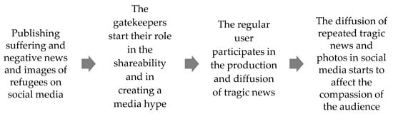 Since social media users are dynamic transporters of information, they are involved in sharing and recommending content to their friends and followers. The regular user participates in the production and diffusion of news via social media. The interference of those gatekeepers in the repeated dissemination of tragic news about refugees on social media may lead to fatigue of the audience’s compassion (Vasterman 2018) The media then generates revenue through clicks, which entail sensationalizing stories (Sacco and Gorin 2018). This sensationalization means that the real stories often become lost and have a reduced impact on the public when shared, simply because they do not have shock value (Mast and Hanegreefs 2015). Media bear a great responsibility in highlighting the most important issues in societies. Audience see that online media is much more effective in this regard, and they prefer online media over traditional media when following up on people’s rights issues, as traditional media must follow a winning strategy and do more in this regard (Aldamen 2017). News and media outlets that attempt to reach their audience have to adjust to the rules of those outlets and their aspects of shareability and algorithm. In this case, regular users can create accidental media hype (Roese 2018). Shareability is a significant aspect that means not only do the practical requirements given by social media enable information to spread, but it also means that the user is a dynamic transporter of information shares and recommends content to other friends (Roese 2018). The notion of “media hype” is often related to high news worth. Any emotion can trigger accidental media hype. Thus, there is evidence that compassion peaks shortly after exposure and then reduces as individuals become accustomed to tragic images (Baldacchino and Sammut 2015). There is also the issue of repeated exposure to the crisis news through statuses and sharing of news articles. Over time, it is not easy to retain a high level of compassion.