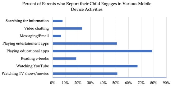 There were clear patterns of popular and unpopular mobile device activities amongst the children in our sample (see Figure 1). The majority of parents reported that their child plays educational apps (78%) and watches YouTube videos (67%). About half also spend time playing entertainment apps and watching television shows or movies. Less than a quarter of children were reported to read e-books on their mobile devices or use video chat platforms, such as FaceTime, to communicate with others. Very few children were reported to use their mobile devices to search for new information or send messages to others.