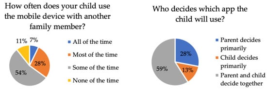 To address co-use and parental mediation strategies, we asked how much of the child’s time spent on a mobile device was spent using that mobile device together with another family member (response options ranged from “all of the time” to “none of the time”). We also asked who generally decides which apps the child will use: primarily the parent, primarily the child, or the parent and child together. Finally, parents were asked to “tell us any rules or expectations you have around your child’s mobile device use at home” (open-ended).