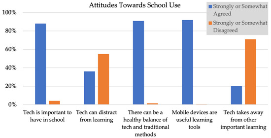 Overwhelmingly (92%), parents agreed that it is important for children to have access to technological tools in the classroom (see Figure 4). Moreover, 96% of respondents agreed that mobile devices are useful learning tools within classrooms. Parents also held positive attitudes towards balancing traditional teaching methods with technology-based methods; 94% of respondents agreed that a healthy balance is possible. Parents’ attitudes about the potential negative impacts of technology use in classrooms varied widely. Over a third (38%) of respondents agreed or strongly agreed that technology can distract from learning, while 58% of participants disagreed with that statement. Similarly, while 21% of respondents believed that technology use in classrooms takes away from important learning, 74% disagreed.