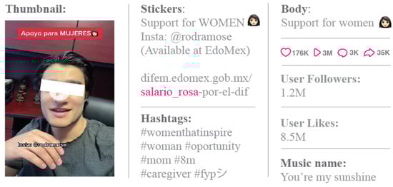 When we conducted a preliminary investigation on TikTok, we found that some influencers (TikTokers) were tagging their content with the hashtag #SalarioRosa in the comments, text and/or linked hashtags. Figure 3 exhibits a TikTok video from the account @rodrigoramose; this is one of the most popular TikTok videos, with over 8.5 million likes and over 3 million plays; this TikTok video was found in the data set gathered on 29 October 2022. The tag #SalarioRosa is related to other words in text, stickers and hashtags: mujeres (women), “EdoMex” and “fyp” (for you page).