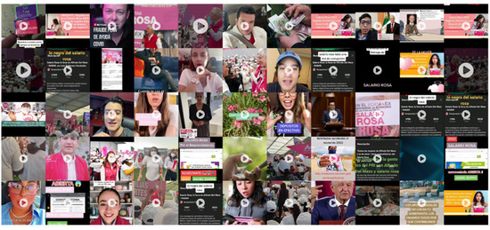 A picture wall of TikTok thumbnails was created from the data set gathered from the TikTok videos, as shown in Figure 4. The “Duet” function is specifically mentioned as being utilized for content dissemination. This enables users to employ a published video as background or to refer to it. This refers to photographs and videos showing, mainly, the image of the Governor of the State of Mexico, Alfredo del Mazo, or political rallies.