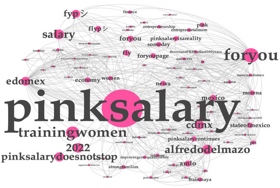 Together with the text included in comments, the body of a post, hashtags, and stickers, the main hashtag #SalarioRosa and its associated hashtags were taken into consideration as words when conducting the TikTok analysis. Figure 5 shows a relevant word network with the keywords that were primarily used in the publication’s text, tags and in the comments. This word network shows how frequently these words are used on TikTok; the bigger the node, the more frequently it is used.