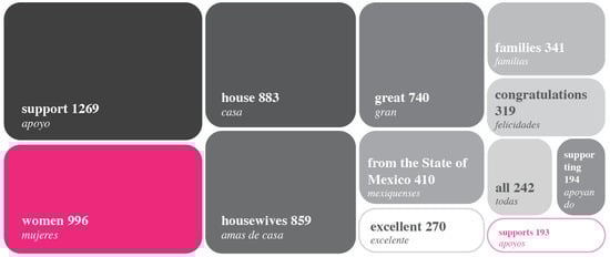 Finally, the most frequent terms on TikTok campaigns are displayed in Figure 6. We can see that the majority of these words is closely associated with hashtags that promote women. It should be emphasized that TikTok videos contain words that were counted in the text, replies hashtags, comments, replies, body and related hashtags However, the key component of these kinds of propaganda campaigns is still video material. The data set was filtered to match the related content to the hashtag #SalarioRosa.