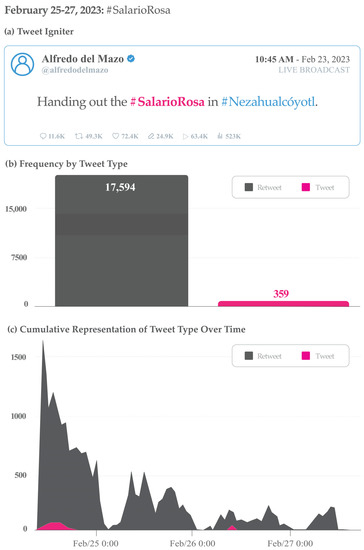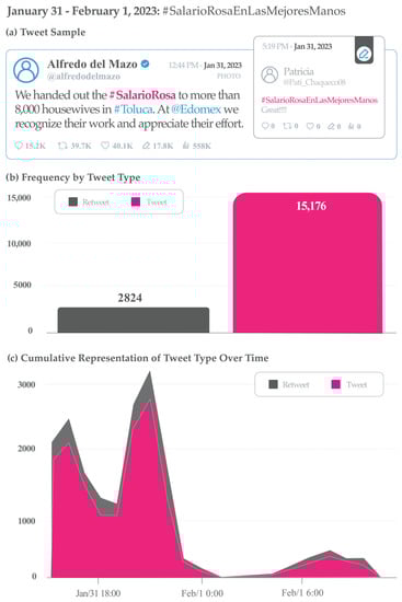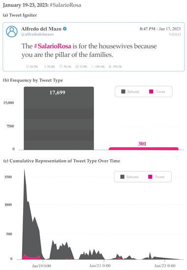 Particular view of the “Mimicking Conversation” strategy: quote retweet. Data related to the hashtag #SalarioRosaEnLasMejoresManos (Pink Salary in the best hands) from 31 January–1 February 2023, including: (a) Tweet sample; (b) Frequency by tweet type; and (c) Cumulative representation of tweet type over time.