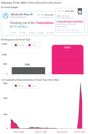 Particular view of the “Mimicking Conversation” strategy: quote retweet. Data related to the hashtag #SalarioRosaEsUnaRealidad (Pink Salary is a reality) from 15–16 February 2023, including: (a) Tweet sample; (b) Frequency by tweet type; and (c) Cumulative representation of tweet type over time. Data from Twitter.