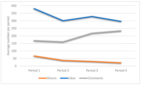 Mean of comments, shares, and likes on COVID-19-related Facebook news posts per period.