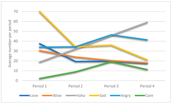 When further zooming in on news posts discussing COVID-19 and differentiating our dataset per quarter, a few intriguing tendencies surface, as schematised in Figure 3. The average use of ‘Love’, ‘Wow’ and ‘Sad’ reactions moderately declined throughout our four three-month periods. The ‘Care’ option shows an initial increasing trend in period one, two and three but in the last studied period, the use went down again. A similar trend can be seen for the ‘Angry’ button, which gained quite some relevance among Facebook users engaging with Flemish pandemic-related news, but in period four the average use slightly drops. The most interesting trend is the ‘Haha’ option, which shows a steep incline in our studied period. While already frequently used in the first 6 months, the ‘Haha’ option in the fourth period emerged as the most often-used reaction. The general ‘Like’ option is not included in the figure below as it scores considerably higher than the other options. Here too, though, a general decline in the average number of likes per post becomes apparent throughout our four periods, with a drop from 160 to 120—still twice as much as the second most popular reaction type in the fourth and final period, which was the ‘Haha’ reaction.