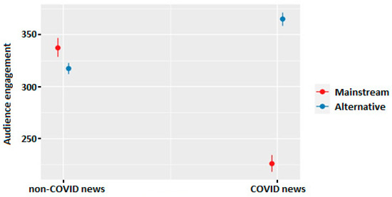 When we zoom further in on the difference in engagement between news topics and news posts, we find a significant difference. In Figure 4, the interaction is plotted to make interpretation more straightforward. Here, we see that the audience engagement for non-COVID news was similar for the alternative and mainstream media Facebook posts. This is not the case for COVID-related news. Here, we found a difference between the alternative and mainstream media posts, where COVID-related news generated more user engagement for Facebook posts by mainstream media outlets.