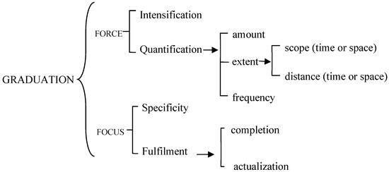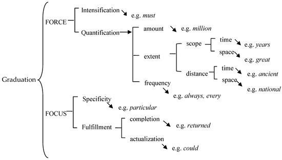 Hood and Forey’s (2008, p. 395) graduation network is shown in Figure 1. Quantity can be graded in terms of the domain of force as the amount (e.g., “many times”), extent in time (e.g., “almost a month”), distance in time (e.g., “within 24 h”), and frequency (e.g., “very often”) (Hood and Forey 2008, p. 395). Focus involves grading the degree of actualization of a proposition (e.g., “it’s probably” there; does it “normally” take a week; “actually”), the degree of fulfilment of a process (e.g., “trying to reach”), and the degree of specificity surrounding an entity (e.g., I spoke with “somebody...whoever”) (Hood and Forey 2008, p. 395). The appraisal system is used to evaluate interpersonal meanings in texts (Martin and Rose 2007; Martin and White 2005). Graduation, attitude, and engagement are features that combine to construct interpersonal meanings. Understanding how different lexicogrammatical features are used to realize attitudes is important in discourse analysis. The present study aims to contribute to the understanding of how graduation resources are used to adjust writers’ attitudes in news discourse.