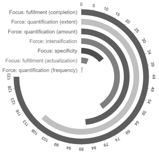 The data analysis shows that all the texts examined contain graduation tokens. A total of 440 graduation tokens were identified across the corpus. Notably, 45% of these tokens are associated with force (quantification), while 30% of the tokens are associated with focus (fulfilment). The overall frequency patterns of fulfilment, specificity, intensification, and quantification are visualized in Figure 3, which shows their frequency distributions. The most common quantification categories are quantification (extent and amount), intensification in the force domain, and fulfilment (completion) in the focus domain.