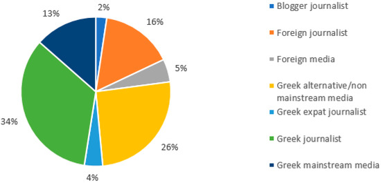 Figure 1 shows Greek journalists as the main protagonists of communication during election periods, with a percentage of more than 34%. This is followed by the accounts of alternative/non-traditional media and journalists from other countries. Blogger journalists also show a high frequency of messages posted.