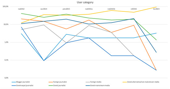 Figure 2 is a logarithmic chart showing the development of the appearance of users’ categories. A logarithmic scale is preferred as it offers a compact way to display numerical data over a vast range of values, enabling them to fit within a small graph. It is observed that, over the years, the participation of blogger journalists and Greek alternative/non-mainstream media in discussions has been on the rise. Specifically, while their participation remains stable from 2012 to 2015, their activity becomes more prominent in the 2023 elections. On the other hand, the participation of Greek journalists consistently decreases. While they generate 40.9% of the total tweets during the 2012 elections, their messages represent only 1.4% of the total messages in the 2023 elections. Journalists and media outlets based outside Greece (foreign media, Greek expat journalists and foreign journalists), as expected, do not show a continuous interest in the country’s internal electoral processes. From 2012 to 2015, due to the deep and intense economic, social and political crisis that the country was facing, the Greek electoral processes attracted the attention of the international media. However, in 2023, the Greek economy had already been upgraded by international rating agencies, the country’s economy had stabilized, and the internal electoral processes did not present significant international interest.