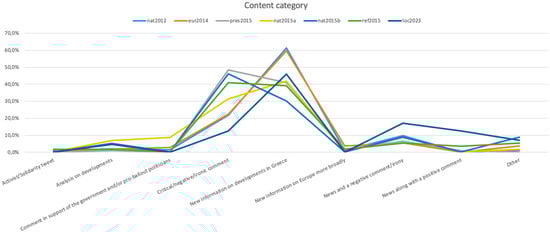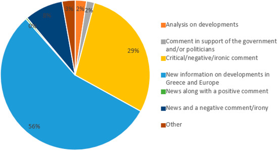 It is observed (Figure 4) that, over time, news related to developments in the country (“new information on developments in Greece”) consistently appears with high percentages. This category of content is the one with which journalists and media outlets are more familiar in their online activities. However, even critical/negative/ironic comments are high in their preferences. This is a category of content that does not belong to the usual journalistic practices in the online world of media, as the expression of the journalist’s personal opinion is considered a non-traditional element of news (Lasorsa et al. 2012). This trend indicates that journalists have managed to adapt to the demands of social media and their users, promoting a more open discussion on the Internet.