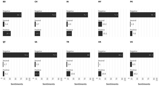 Percentages of different sentiments across countries. The acronyms of the countries are used in the figure: Bangladesh → BD, China → CH, India → IN, Malaysia → MY, Pakistan → PK, Qatar → QT, Saudi Arabia → SA, Turkey → TR, United Kingdom → UK, United States → US.