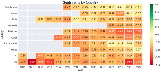 Over the years, mean sentiment values consistently leaned toward the negative spectrum across all countries (see Figure 2). Notably, Bangladesh, China, Malaysia, Saudi Arabia, and Turkey exhibited relatively higher proportions of lower negative sentiment than Pakistan, Qatar, the UK, and the US, which consistently portrayed higher negative sentiments in their news coverage. Particularly, the US maintained yearly consistency of higher negative sentiment throughout the study period, with the highest mean negative sentiment score and variation (M = −0.53, SD = 0.2). However, the mean sentiment scores in Pakistan and Qatar were also higher but with limited variation, indicating their concentrated sentiments and consistency in their higher negative sentiments (see Table 2).