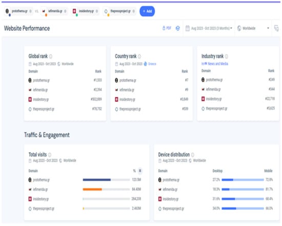 There were two criteria by which the online newspapers listed in Table 1 were selected. The first has to do with the traffic of the websites, and the second is related to the type of funding, whether it is advertising-based or subscription-based media. Regarding traffic, we derived the data from the ranking of the online platform similarweb.com. SimilarWeb.com is a website and a digital marketing intelligence platform that provides insights and data about website traffic, user engagement, and online market trends (see Figure 1). It gathers data from various sources, including web crawlers, ISP data, and proprietary algorithms, to estimate website traffic, visitor demographics, referral sources, and more. Based on the above website ranking system, protothema.gr comes first in traffic, followed by iefimerida.gr, insidestory.gr, and finally, thepressproject.gr. In terms of funding, the first two online media rely on advertising, unlike the next two, which base their revenues on subscriptions and reader donations.