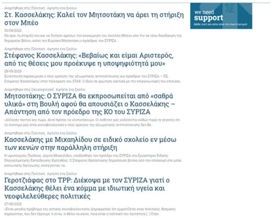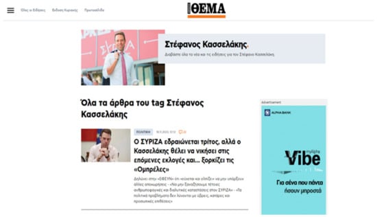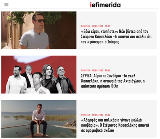 It is clear that there is no in-depth analysis of the events but a simple reproduction of statements and comments made on social media. Several times, it was observed the phenomenon that the name Stefanos Kasselakis is mentioned in the title, but, in fact, the content of the article does not refer to or directly concern him, and this proves once again the pursuit of clicks and high engagement rate. After all, it is quite common in today’s digital landscape for many news organizations to find themselves in a challenging situation, torn between adhering to online trends to attract public attention and make a profit, while maintaining their reputation as trustworthy news sources (Silverman 2015).