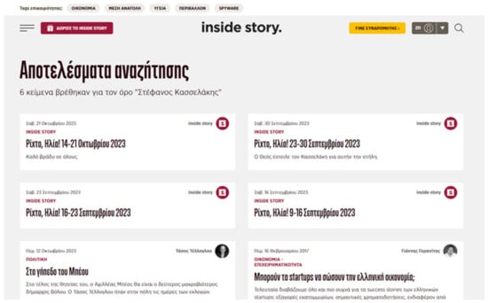 Screenshot of the search results of insidestory.gr about Stefanos Kasselakis.