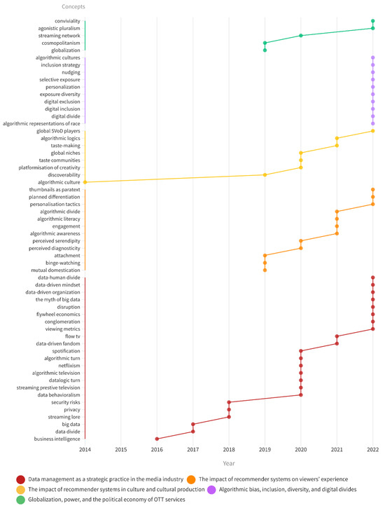 Figure 4 represents the chronological evolution of the thematic categories and the emergence of the main concepts operationalized in the research. It is evident that the theme of data management as a strategic practice in the media industry, present since 2016, is the one that remains the most consistent over time (with the exception of 2019) and is accompanied by substantial conceptual development. In the opposite direction, it becomes equally evident that the thematic category encompassing algorithmic bias, inclusion, diversity, and digital divides has only very recently (2022) begun to emerge on the communication research agenda, following the most recent discussion about the need to regulate AI applications, considering their social impacts.