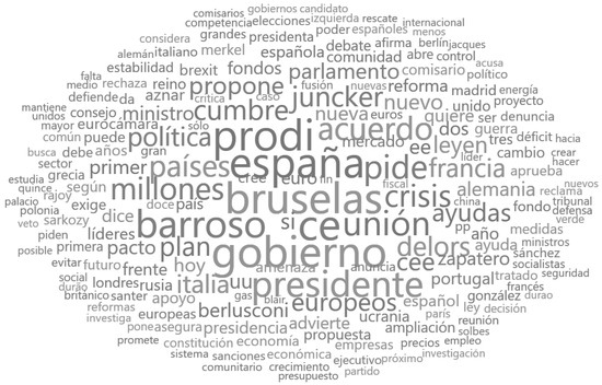 | Romano Prodi (1999–2004) | Berlusconi (31), Italy (20), pact (15), Zapatero (12), Aznar (11), stability (11), asks (9), says (9), crisis (9), minister (9), confidence (9) | Italy (32), Berlusconi (24), Italian (23), Aznar (14), Spain (13), asks (13), says (13), crisis (12), center-left (12) |