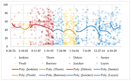 - Headline allusion (nominal categorical variable). Measures which of the eight representatives mentioned the title of the piece refers to (Roy Jenkins, Gaston Thorn, Jacques Delors, Jacques Santer, Romano Prodi, José Manuel Durão Barroso, Jean-Claude Juncker, or Ursula von der Leyen).