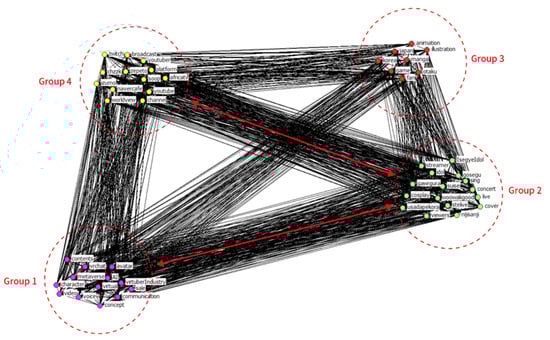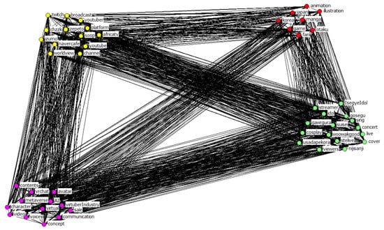 Based on the frequency and network analysis related to VTubers, cluster groups for each keyword were derived using the CONCOR methodology. Examining the relationships between these groups based on the CONCOR analysis revealed that the clusters of the four groups were structured as shown in Figure 5.
