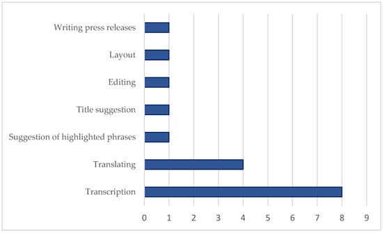 Practitioners’ awareness of the rapid development and adoption of AI technologies supports the idea that the technologies have great potential and, like it or not, they will eventually become part of the daily practice of journalism. For C2, “AI tools will be standardised, and this will benefit journalism, as has happened with many technological developments”. C1, on the other hand, believes that “they’ll end up complementing and benefiting not only basic news writing, but also deep reporting”. C7 has a similar opinion, “Maybe in a few years they’ll improve to the point where they can write good reports, slow journalism and novels”. However, the evidence suggests that the use of AI tools is currently limited to a few very specific tasks and the outcomes do not consistently meet quality standards. For example, eight of the eleven professionals who used AI do so to transcribe interviews, and four to translate texts. Suggesting keywords and headlines, proofreading, and creating illustrations and layout are performed by one out of eleven. The most sophisticated application, the writing of press releases, is a task also performed by just one (Figure 1).