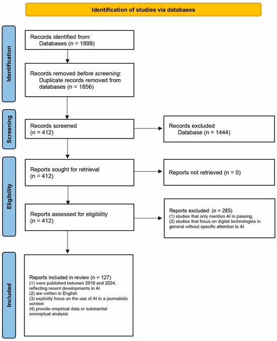 Inclusion and exclusion criteria were strictly defined to ensure that the review remained focused and manageable. Studies were included if they: (1) were published between 2010 and 2024, reflecting recent developments in AI; (2) were written in English; (3) focused explicitly on the use of AI in a journalistic context; and (4) provided empirical data or substantial conceptual analysis. We excluded studies that only mentioned AI in passing or that focused on digital technologies in general without specific attention to AI.