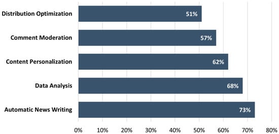 The data in Figure 4 suggests that AI technologies are being embraced across different aspects of journalism, with a particular emphasis on content creation and data analysis. Even the least adopted application, Distribution Optimization, is used by over half of the surveyed group. This indicates a significant integration of AI tools in modern journalism practices, especially in areas that can improve efficiency and content quality.
