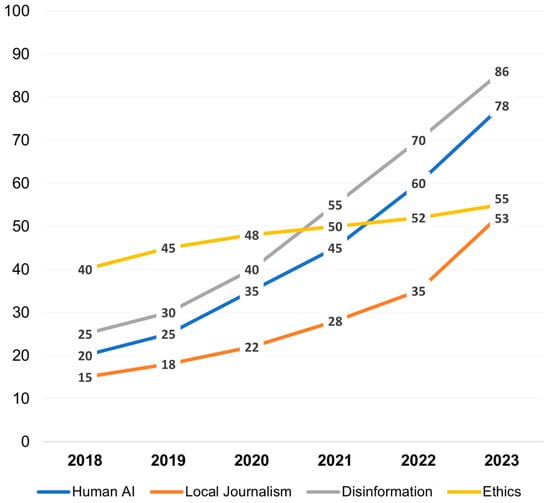 The research trends identified in Figure 6 indicate promising directions for future investigations. The increased interest in human–AI collaboration reflects a shift from a deterministic view of technology towards a more nuanced understanding of how humans and machines can work together in news production.
