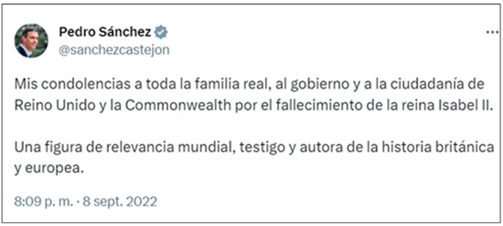 Regarding the government, it was the president’s personal profile—and not the @desdelamoncloa account—that conveyed the condolences. Sánchez underlined the “historic role” of the monarch (Figure 2).