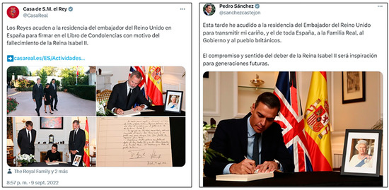 Figure 1 shows the tweets published by the Spanish Royal Family after the death of Elizabeth II. Through this channel and on the web, condolences were expressed to the Royal Family and the British people, including a telegram that Felipe VI sent to the Prince of Wales at the time. It also provided photos of the King and Queen of Spain with Elizabeth II, underlining the British monarch’s “dignity, sense of duty and courage” and posted a video of Felipe VI expressing his condolences from an event in Seville. The story focused on the death and praised the character (in line with the strategic story).