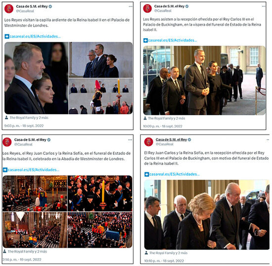 During the funeral, photos of the King and Queen of Spain and consorts at the burial were disseminated without any commentary. It is important to underline that, in line with the strategic account maintained in Spain, @CasaReal showed the emeritus monarchs but not a joint photo with the current monarch. The official account merely reported the presence of the current monarchs and also the Emeritus King Juan Carlos I and Queen Sofia in London (Figure 4).