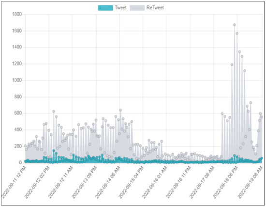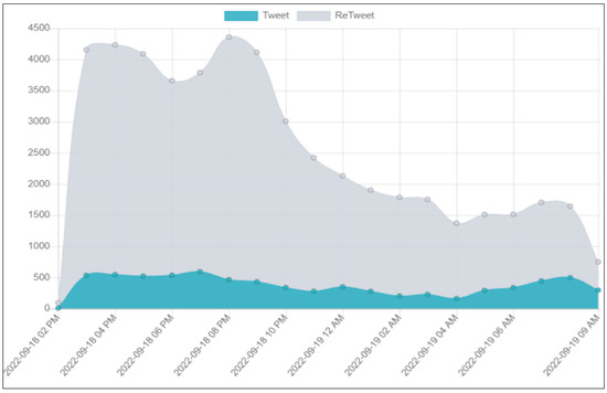 Figure 5 shows 50,000 tweets and retweets in Spanish about Elizabeth II. The peak of attention occurred between 14:00 and 20:00 on 18 September, but the conversation continued into the early hours of the morning. The mentions of the deceased allow us to determine a central narrative about the character. Meanwhile, the 50,000 tweets and retweets about Juan Carlos I from 11 to 19 September extended the time frame because, as expected, there was less conversation than about Elizabeth II, although it increased on 18 and 19 September, when the funeral was held (Figure 6). The sample of tweets shows an important peak of attention on the web on 12 September, when the emeritus’s attendance at the funeral was announced.