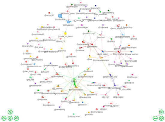 Figure 7 and Figure 8 present the most active users on Twitter, mentioning Elizabeth II and Juan Carlos. In the first case, as can be seen, there were no strong connections between them. Media accounts such as RTVE and El Mundo are the most prominent, along with other personal accounts and those of politicians such as Joe Biden, president of the United States. However, in the case of Juan Carlos I, unlike Elizabeth II, we did find established plots and networks which reflect the polarisation around the figure. Thus, some are linked to Republican users—@miercolesrepublicano, @jesuscintora, @allazy, @joaquinbosh, @pabloechenique…, connected with a section of the media, @laser, @elperiodico…—and others to monarchists—@gestradamo, @nba1marisa, @vozpopuli and @eldebate.