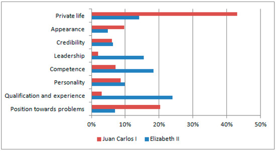 The discourses varied in the media and on social networks. Internet users were more interested in the private life of Elizabeth II (42.9%), barely touched by the press, and journalists were especially interested in her qualifications and experience (25.6%), in line with what the official agendas had emphasised. It is interesting to note that both media avoided mentioning the Queen’s physical appearance (Table 5).