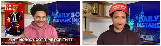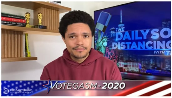 In this paper, we analyze and compare how TDS presented the coverage of the 2020 and 2024 US elections, paying attention to Trevor Noah’s pandemic, socially distanced spoofs, and 2024 Stewart’s return in a live studio setting. The pandemic era significantly influenced The Daily Show’s satirical approach in 2020, shaping both its format and thematic focus toward a more monologue-driven style and a home-based setup that emphasized social justice, misinformation, and voter suppression—key concerns heightened during Trump’s presidency (). Without a live audience, Noah relied heavily on digital satire, parody, and irony to engage viewers, compensating for the absence of real-time audience reactions. This era highlighted the adaptability of satire in responding to crises, reinforcing its role as both a critique of political discourse and a means of public engagement.