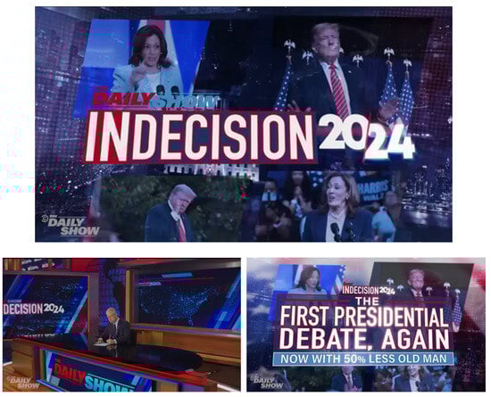 - The Daily Show. (2024a, September 11). Jon Stewart tackles Harris & Trump’s debate and what this means for the election [Video]. YouTube. Available online: https://www.youtube.com/watch?v=KtHn59wqdBc (accessed on 14 November 2024).