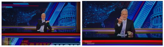 Semiotic analysis examines how textual, visual resources, and choices are used to construct representations of political events and social practices. Drawing on MCDA by () key elements include analyzing overlexicalization, suppression, structural oppositions, and ideological framing in language. Visual analysis focuses on elements such as cultural and biological categorization through dress and gestures, symbolic contact through gaze direction, and the positioning of actors in terms of distance and angle. The study also employs representational strategies to analyze how TDS constructs social actors. This includes examining individualization versus collectivization, nomination versus functionalization, and the use of honorifics to convey authority or irony. () used ’s () term of ideological squaring because representational choices stated by speakers play an important role in affecting people’s ideologies and stance. The analysis explores how pronouns like “us” and “them” establish ideological divides. For instance, Noah’s framing of Trump supporters as “them” versus the progressive audience as “us” reflects the show’s ideological positioning. Similarly, Stewart’s collectivization of Democratic campaign failures in 2024 critiques organizational inefficiencies, while Noah’s individualization of Trump in 2020 emphasizes his role as a disruptor.