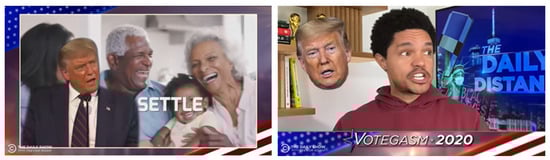 - The Daily Show. (2020, October 1). Trump “stands by” white supremacists in off-the-rails debate [Video]. YouTube. Available online: https://www.youtube.com/watch?v=e3F7wUJ78mc (accessed on 19 April 2024).