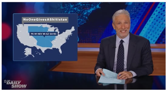 - The Daily Show. (2024b, November 12). Jon Stewart on what went wrong for Democrats [Video]. YouTube. Available online: https://www.youtube.com/watch?v=TKBJoj4XyFc&t=10s (accessed on 14 November 2024).