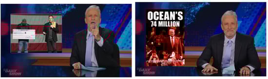 Stewart further ridicules repetitive canvassing, stating, “If there’s one thing people love more than someone appearing randomly at their door once, it’s that same [BLEEP] person coming back two or three times”. This humour underscores the invasive nature of overzealous tactics and the frustration of voters subjected to them. By contrasting the Democrats’ outdated methods with Republicans’ simpler, more targeted approaches, Stewart frames the Democratic Party as out of touch with public sentiment. The second image, depicting a mock movie poster titled “Ocean’s 74 Million”, reframes Trump’s massive voter base as part of a heist and fraud. The red and black color scheme evokes drama and danger, mirroring Hollywood-style capers. Stewart’s tone matches the poster’s theatricality, as he wryly declares, “It turns out the election was stolen, by more people voting for Donald Trump”. This statement mocks the Republican narrative of election fraud by ironically framing high voter turnout as the “theft” of the election. Stewart’s body language, tone, and visual aids work cohesively to critique the failures of both political parties. In the first image, his pointing gesture and open mouth signal incredulity and anger, symbolizing the futility of Democrats’ strategies. The contrast between his frustration and the peaceful, hopeful poster highlights the perceived emptiness of symbolic gestures when faced with electoral realities.