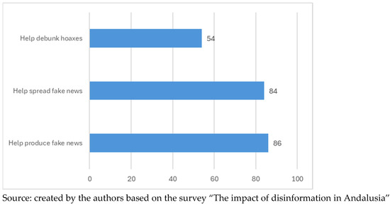 At the other end of the scale, 54.2% of respondents believe that AI will help detect fake news. In net terms, therefore, pessimism carries the day. Differences are observed between the perception of women and men, as the former place greater trust in the help that AI can provide in fighting disinformation. There is also a positive relationship between trust and other socio-demographic variables: social class—lower-class people—and ideology—left wing. These last pieces of data are significant since it has been proven that people who identify with the right wing are more likely to share false content, and therefore, are more vulnerable to this problem (Nikolov et al., 2021).