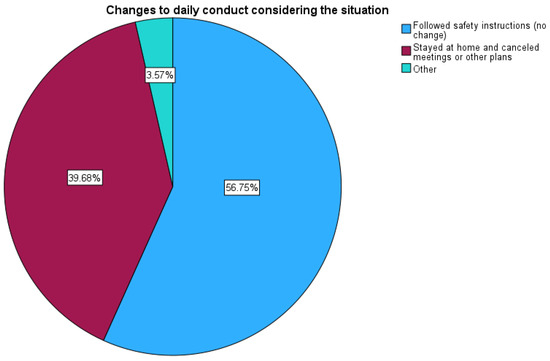 When asked whether they made any changes to their daily conduct considering the situation (the missile attack), most respondents reported having followed safety instructions and/or no change (56.75%), followed by 39.68% of the participants who reported staying at home and/or canceling meetings and 3.57% who responded taking other measures (see Figure 1).