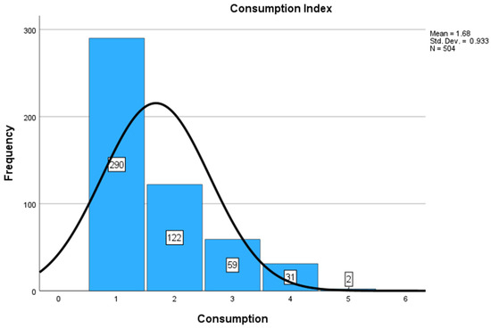 The consumption index variable, which was composed of the respondents’ choice of one or more of the update options (TV, radio, news sites, social media, messages from friends or family, and other), averaged at 1.68 (SD 0.93), ranging from 1 to 5 (see Figure 4).